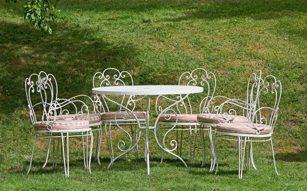 7-tlg.; Tisch und sechs Armlehnstühle. Metall, weiß lackiert. Gestell aus stark geschwungenen, volutenartig angelegten Rundstäben als Träger für runde Deckplatte. Korrespondierende Stühle mit Polsterauflage. Tisch-H. 74 cm. D. 94 cm. Sitz-H. 44 cm.