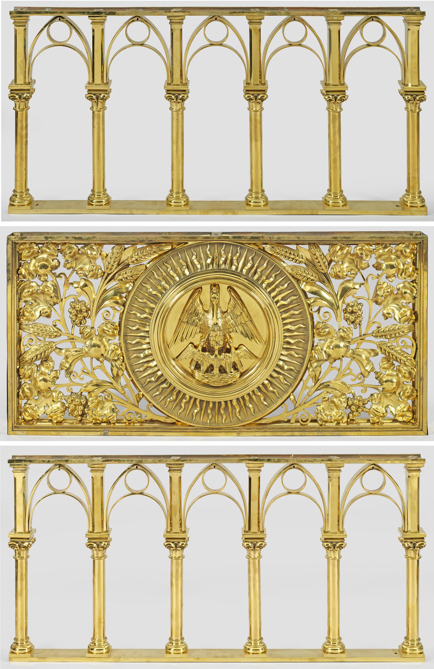 3-tlg.; Messing, vergoldet. Jeweils querrechteckig angelegter, durchrochen gearbeiteter Korpus aus zentralem, von Strahlen umgebenen Relieftondo eines Pelikans mit seinen Jungen, als christliches Symbol für Opferbereitschaft und Hingabe und somit als Zeichen für Hoffnung und Trost, umgeben von üppigem Blattwerk bzw. aus Säulenarkaden mit stilisiertem Maßwerk. Je 52 cm x 104 cm bzw. 108 cm.