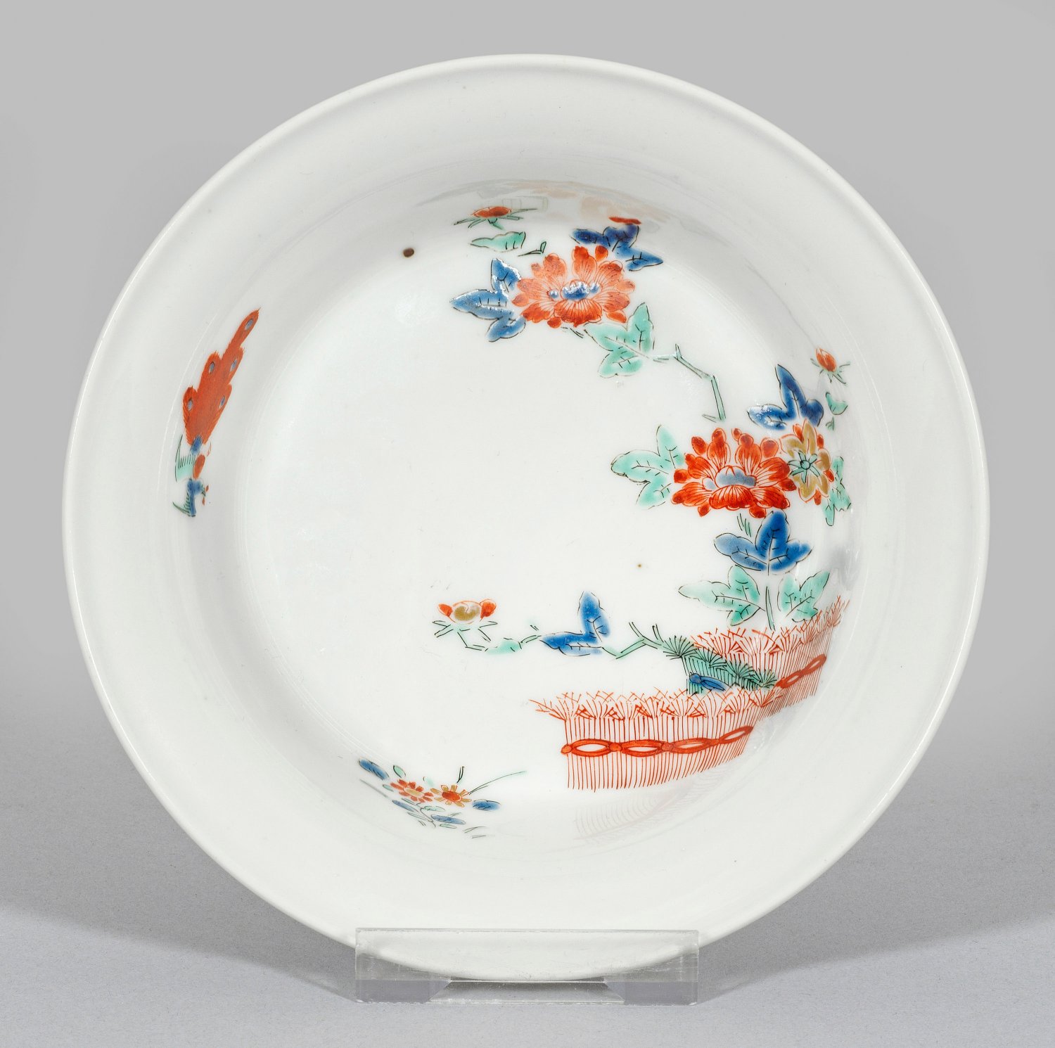 Über ausgestelltem Rundstand haubenförmig sich erweiternder Korpus mit auskragendem, profiliertem Rand. Im Spiegel Päonienstrauch aus einer Hecke mit Reisigbündeln hervorgehend. Seitlich fliegender Hôô-Vogel (Phönix). Polychrome Aufglasurmalerei. Im Boden schwarze Johanneums- bzw. Palais-Nr. "N =47 - I". Brandfleck. Äußerst minim. Haarriss. H. 5,5 cm. D. 15 cm.