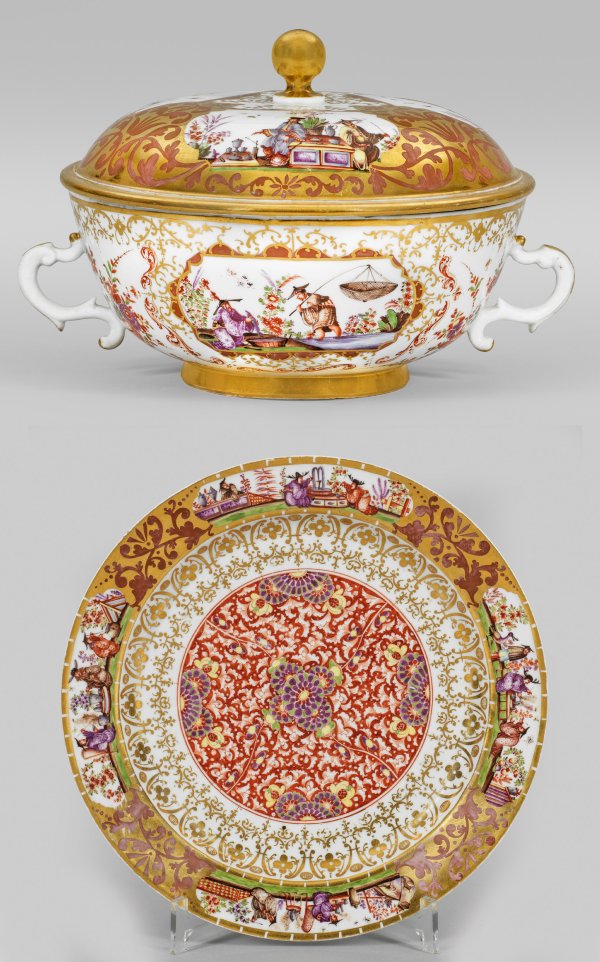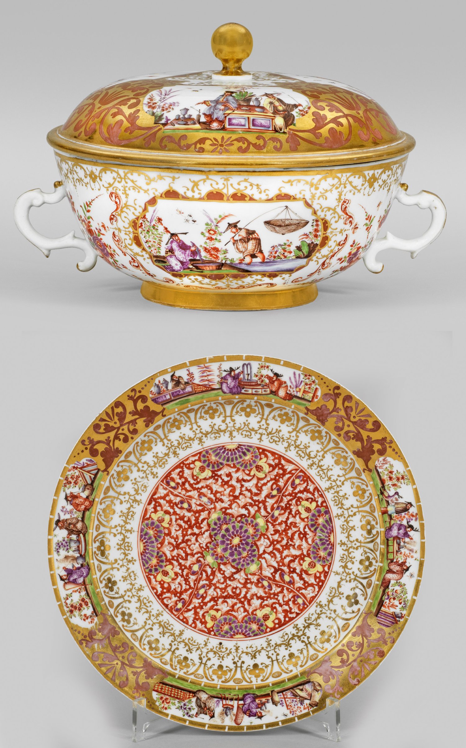 2-tlg.; Halbkugelig sich erweiternder Korpus mit Rocaillehenkeln sowie passig gewölbtem Deckel mit Kugelknauf. Beidseitig der Wandung große, vierpassige, von Laub- und Bandelwerk in Purpur und Eisenrot gerahmte Goldornamentreserve mit Lüsterfond (sog. Böttgerlüster). Darin unterschiedliche, szenische Darstellungen von Chinesen in blühenden, asiatischen Gartenlandschaften, sitzend bei der Teezeremonie mit dampfendem Kessel, spielendem Äffchen und Vogel bzw. bei der Zubereitung von Fisch. Auf dem Deckel drei passige, von Goldornamenten und Böttgerlüster dicht umzogene Chinoiserie-Darstellungen mit Teezeremonie und der Fütterung eines Reihers. Presentoir: Runde Form. Im leicht vertieften Spiegel ein zentrales, von doppelter, eisenroter Ringlinie gerahmtes Rundmedaillon mit floralem Fond aus weiß ausgespartem, stilisiertem Blattwerk, farbigen Päonien und Chrysanthemen. Zwischen Spiegel und Kehlung Goldspitzen- und Vierpassbordüre. Auf der Fahne Bandelwerkbordüre mit Lüsterfond (sog. Böttgerlüster) auf glanzvergoldetem Grund mit vier korrespondierenden sog. Chinoiserien in passig ausgesparten Reserven. Szenische Darstellungen "en miniature" von festlich gekleideten Chinesen in blühender, asiatischer Gartenlandschaft bei der Teezeremonie bzw. bei der Konversation. Auf der Unterseite der Fahne langgezogene Indianische Blütenzweige in Eisenrot, Purpur und Moosgrün. Äußerst feine polychrome Malerei wohl von Johann Gregorius Hoeroldt. Teilw. unw. best.; Schwertermarke. Terrinen-H. 15 cm. Terrinen-D. 18 cm. Presentoir-D. 27,5 cm.