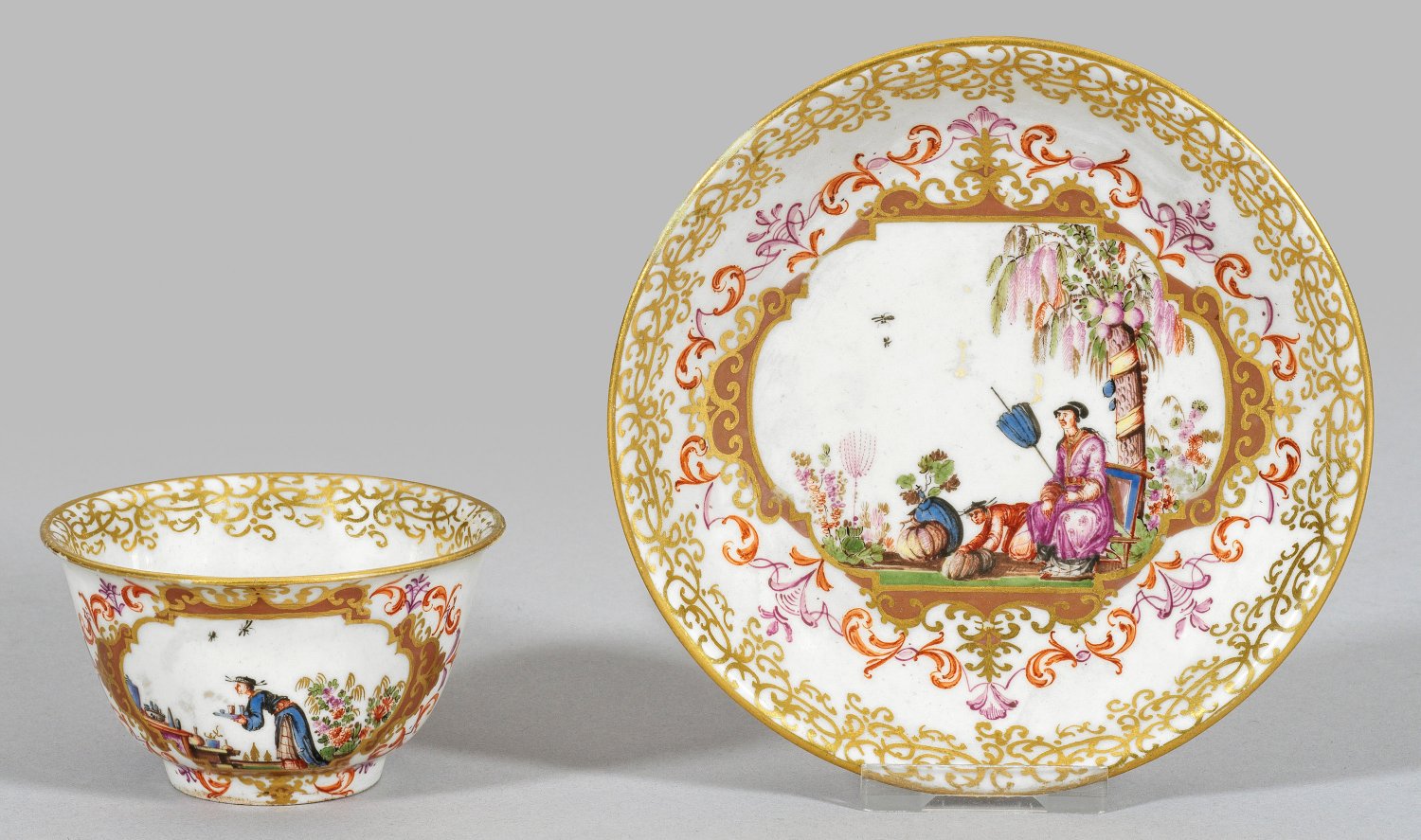 auf Unterschale. Böttgerporzellan. Sich erweiternder, runder Korpus. Beidseitig der Wandung und im Spiegel vierpassige Goldornamentreserven mit Lüsterfond sowie eisenrot-purpurfarbenem Laubwerk. Darin szenische Darstellung von festlich gekleideten Chinesen in blühenden Gartenlandschaften. Bei der Teezeremonie, bei der Kürbisernte bzw. unter einer Palme sitzend. Der Koppchenboden mit asiatischem Blumendekor neben einer Pagode. Umlaufende Goldspitzenbordüre. Außenwandung der Unterschale mit drei eisenroten Ringlinien. Äußerst feine polychrome Malerei wohl von Johann Gregorius Hoeroldt oder Werkstatt. Massezeichen "/". Gold-Nr. 68. Alte Slg.-Etiketten. Teilw. unw. best./minim. rest.; Schwertermarke. H. 4,5 cm.