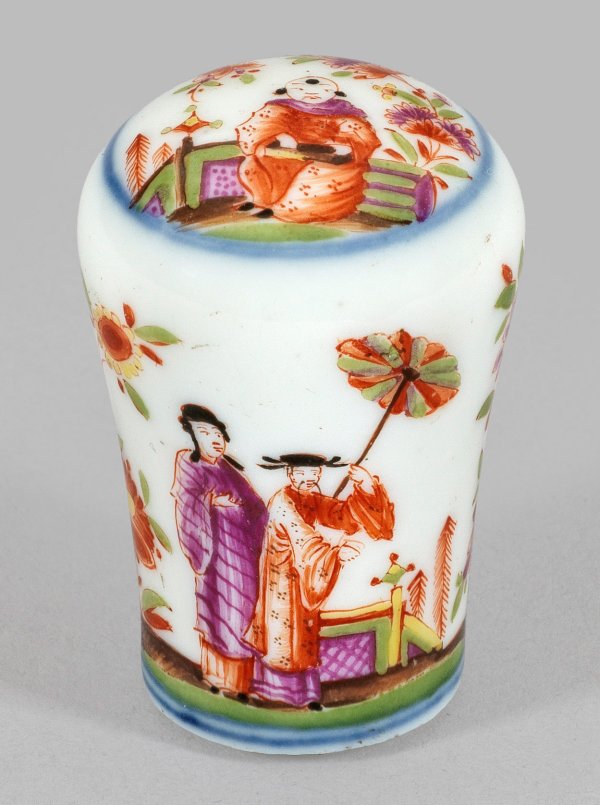 Kolbenförmiger Korpus. Schauseitig auf der Wandung in blühender, asiatischer Parklandschaft mit umlaufenden Chrysanthemenstauden zwei festlich gekleidete Chinesen, einer davon mit Fächer, sog. Fächerchinese. Im Spiegel korrespondierende Szene mit sitzendem Chinesen. Je mit unterglasurblauer, doppelter Ringlinie. Feine polychrome Malerei wohl von Johann Ehrenfried Stadler. H. 4 cm.