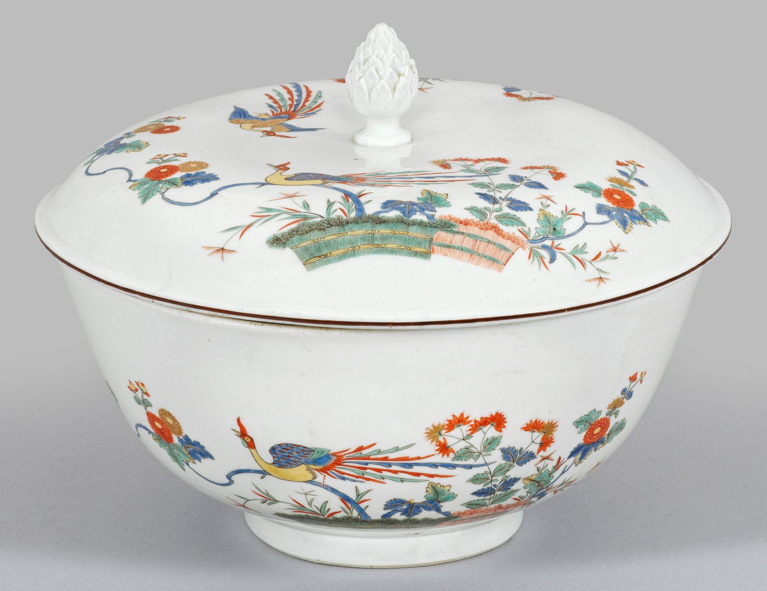 Über dem Rundstand ovaler, sich konisch erweiternder Korpus mit passigem leicht gehöhtem, Braun gerändertem Deckel mit reliefiertem Pinienzapfen als Knauf. Im Spiegel und umlaufend der Wandung feiner Kakiemondekor. Hinter einer Reisstrohhecke sitzender bzw. fliegender Hôô-Vogel (Phoenix), umgeben von blühenden Chrysanthemen- und Ominaeshi-Blütenzweigen. Korrespondierende Blütenzweige innen. Polychrome, Gold gehöhte Malerei. Minim. rest.; Schwertermarke. H. 23 cm. D. 28 cm.
