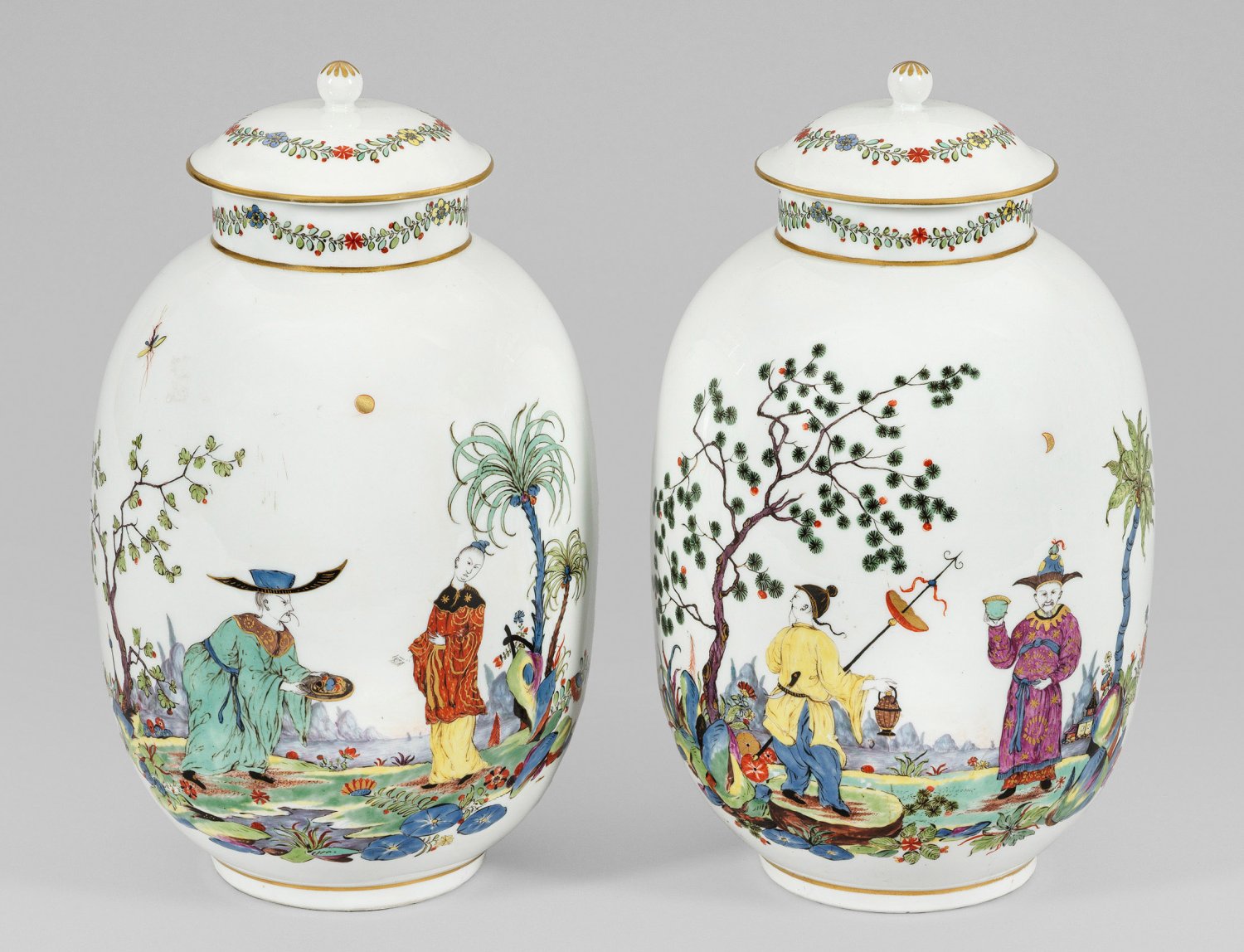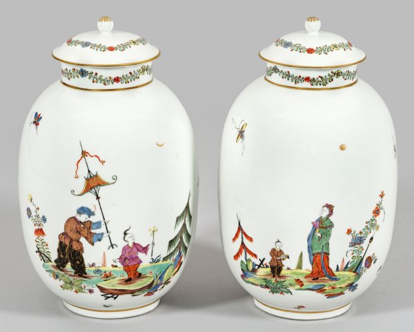 Lot 2675: Paar seltene Meissen Deckelvasen mit Chinoiseriedekor