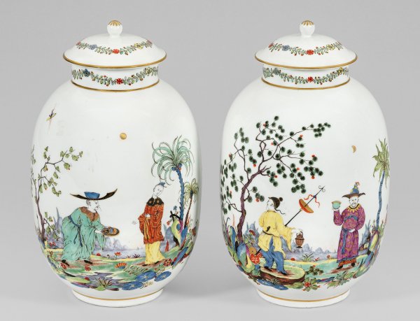 Über dem Rundstand gestreckt eiförmiger Korpus mit kurzem zylindrischen Hals und passigen, leicht aufgewölbten, überkragenden Deckeln mit Kugelknauf. Umlaufend der Wandung großflächig angelegte, unterschiedliche, szenische Darstellungen von festlich gekleideten Chinesen in blühenden Hafenlandschaften, sog. Chinoiserien. Im Schatten von Bäumen, Palmen und Stauden stehende Chinesen mit Fächern, Laternen und Schirmen. Fliegende Insekten und kleine goldene Sonne. Umlaufend am Hals und auf dem Deckel ein Band aus Blatt- und Blütenfestons. Polychrome Malerei mit dezenter Goldstaffage von Adam Friedrich von Löwenfinck oder seinem Umkreis. Die Malerei folgt dem Stil der 1720 entstandenen Serie "Nieuwe geinventeerde Sinesen" von Petrus Schenk d. J., die von den Kupferstichvorlagen abgewandelt übertragen wurde. Deckel teilw. minim. rest.; Schwertermarke. H. 28,5 cm.