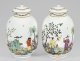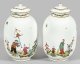 A rare pair of porcelain vases with chinoiserie scenes probably painted by A. F. v. Löwenfinck in the manner of engravings by P. Schenk. Lid partly minor restored. Crossed swords mark.