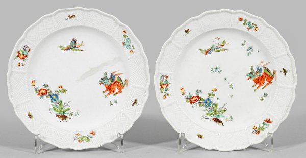 Runde Form mit fassoniertem Rand. Reliefdekor "Sulkowski". Im leicht vertieften Spiegel sog. "Koreanischer Löwe" unweit eines fliegenden Reihers, umgeben von Päonienzweigen, Gräsern und Farnen sowie Maikäfer, auf der Fahne Blütenzweige und Schmetterlinge. Polychrome Malerei im Kakiemonstil in Eisenrot, Emailblau, See- und Moosgrün, Braun, Gelb und Purpur. Altersspuren. Ber.; Teilw. geprägt "E". Schwertermarke. D. 23,5 cm.