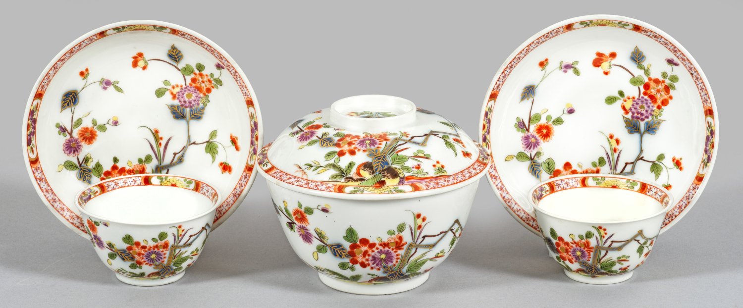 3-tlg.; Leicht gebauchter, sich konisch erweiternder Korpus teilw. mit gewölbtem Deckel bzw. mit passigen Unterschalen. Auf der Wandung und im Spiegel feiner Kakiemondekor aus weit verzweigenden, blühenden Chrysanthemen- und Prunusranken, hinter einem Fels emporragend. Auf dem Deckel bzw. an den Rändern umlaufende Ornamentbordüre aus Mosaikmuster und Blütenreserven. Unterglasurblaue und polychrome, in Gold gehöhte Malerei in Eisenrot, Purpur, Moosgrün, Gelb und Braun. Former- und Dreherzeichen für Peter Geithner Senior (ab 1719 als Weißdreher tätig). Blaumalerzeichen. Schwertermarke. H. 9 cm. D. 10,5 cm bzw. H. 4,5 cm. D. 12 cm.