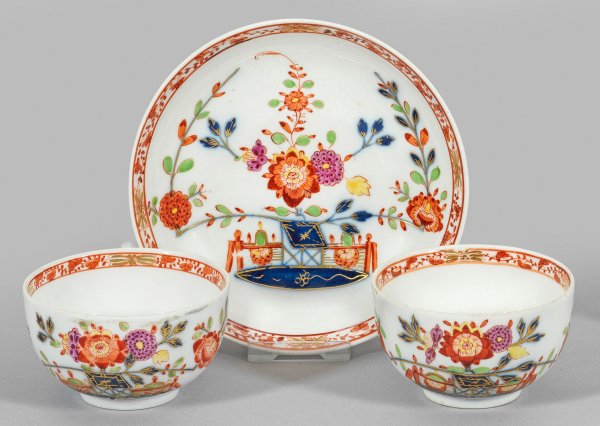 mit einer Untertasse. 3-tlg.; Halbkugeliger Korpus mit gebogtem Henkel. Auf der Wandung und im vertieften Spiegel sog. "Tischchenmuster" mit blühenden Chrysanthemen und Päonien in unterglasurblauer Malerei, überdekoriert in leuchtendem Eisenrot, Purpur, Moosgrün und Gelb. Umlaufende Innenwandbordüre aus Blattranken und Goldblüten. Blaumalernr. und Prägeziffern. Alte, aufgemalte Slg.-Nr.; Teilw. minim. Haariss.; Schwertermarke. H. 5 cm.
