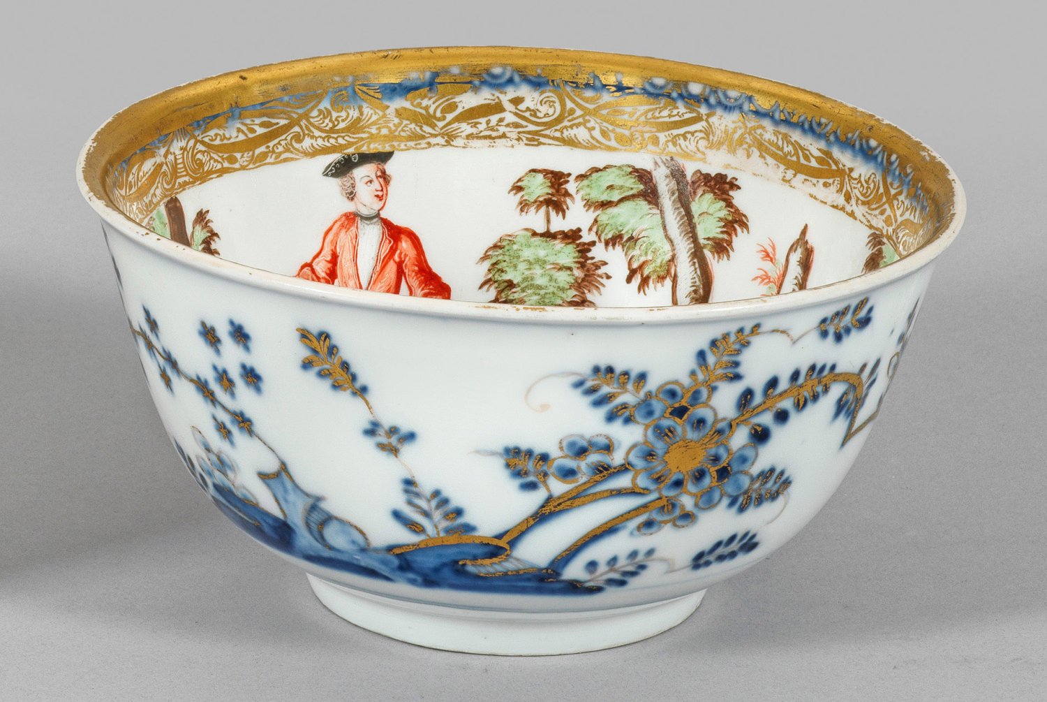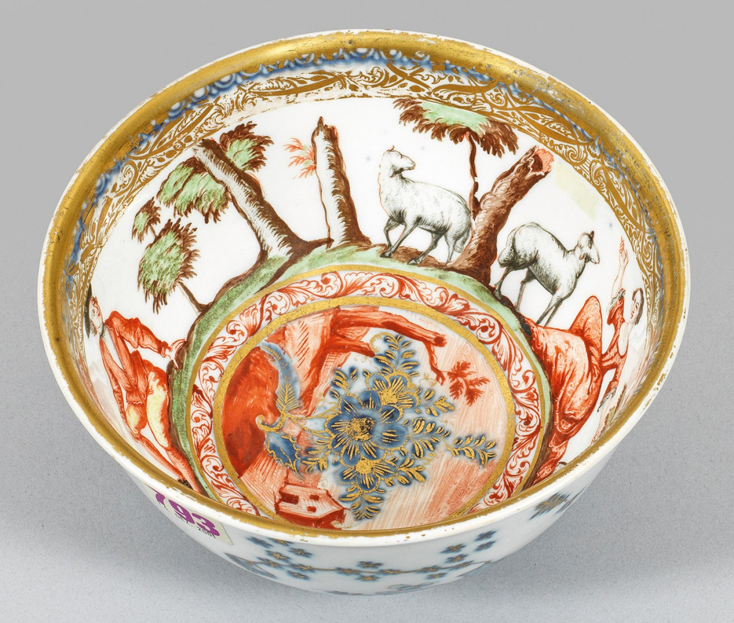 Runder, sich erweiternder Korpus. Unterglasurblauer, goldgehöhter Fels- und Vogeldekor. Innenwandung und -boden überdekoriert mit umlaufender, szenischer Darstellung eines Schäferpaares unweit imposanter Architektur bzw. hügeliger Landschaft. Polychrome Malerei, wohl aus der Hausmaler-Werkstatt F. J. Ferner. Umlaufende Laub- und Bandelwerkbordüren. Schwertermarke. H. 8,5 cm. D. 17 cm.