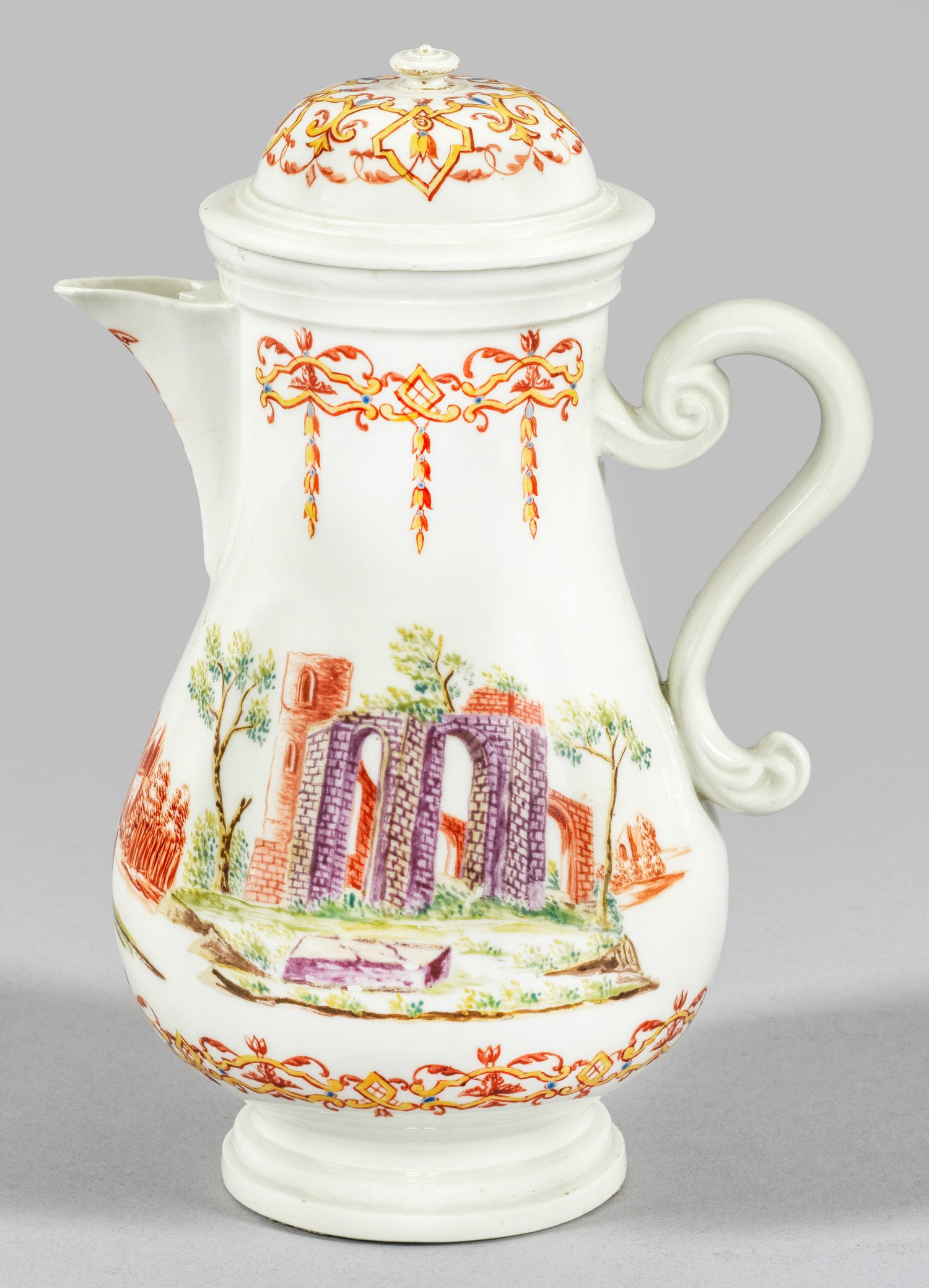 A rare coffee-pot with house painting by J.F. Ferner workshop. Partly restored. Insignificantly chipped.