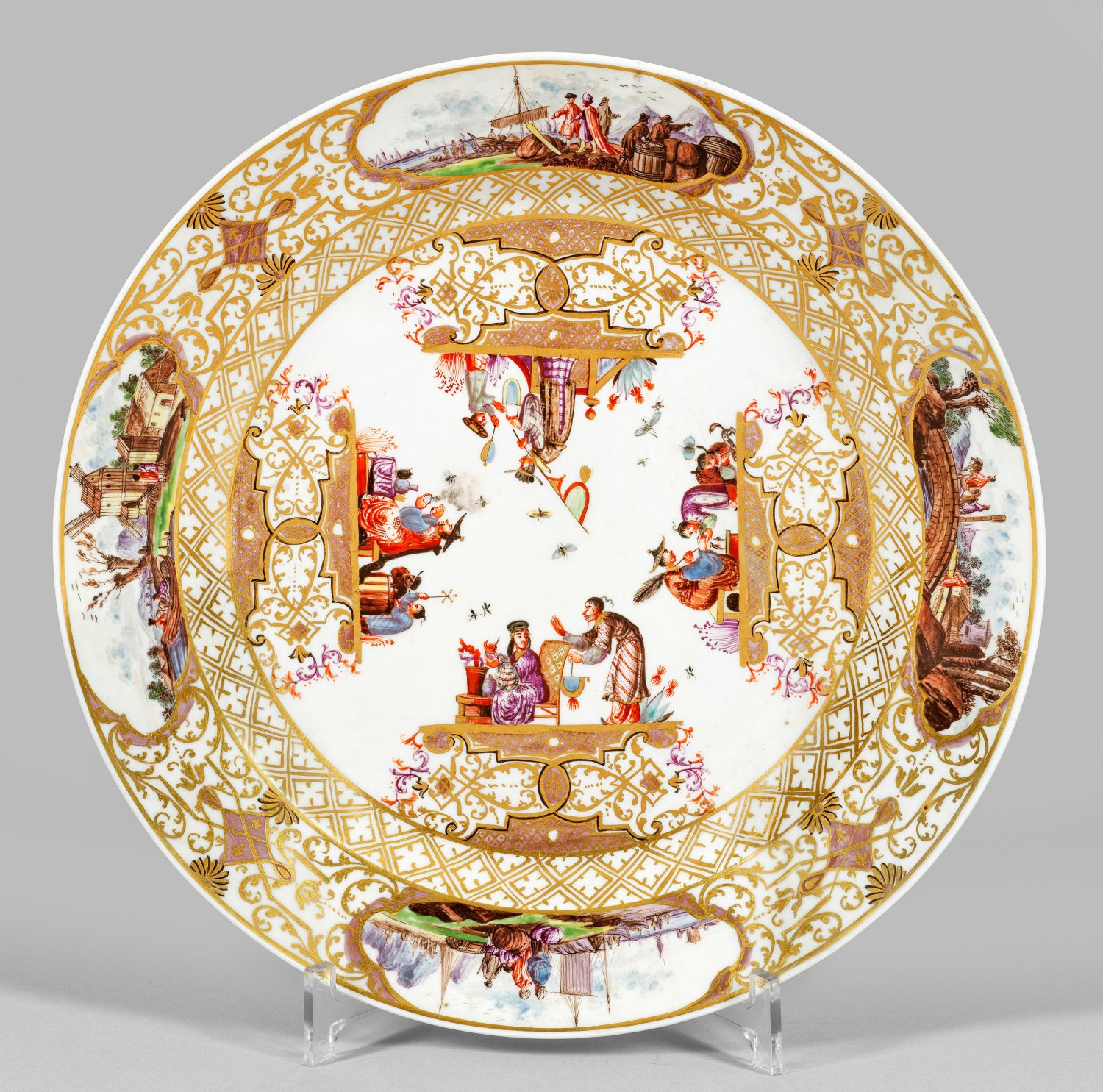 Runde Form mit glattem Rand. Im leicht vertieften Spiegel vier szenische Chinoiserie-Darstellungen von festlich gekleideten Chinesen in blühender Gartenlandschaft, u.a. bei der Teezeremonie, komponiert auf hohen, schwarz konturierten Gitterwerk-Konsolen, reich umzogen von Laub- und Bandelwerk. Auf der Fahne goldkonturierte Vierpassreserven, darin Landschafts- und Kauffahrteiszenen. Spätere polychrome Malerei des Hausmalers Weisse, um 1900 (Vgl. Gielke, Kat. Grassi-Museum, S. 164). Reicher Golddekor aus arabeskem Bandelwerk, Mosaikbordüre mit Lüsterfondflächen. Fahne verso mit Indianischen Blumen. Prägeziffer "3". Minim. rest.; Schwertermarke. D. 30,5 cm.