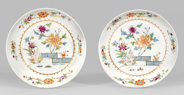 Lot 2691: Paar große seltene Ansbach-Schalen im Famille rose-Dekor