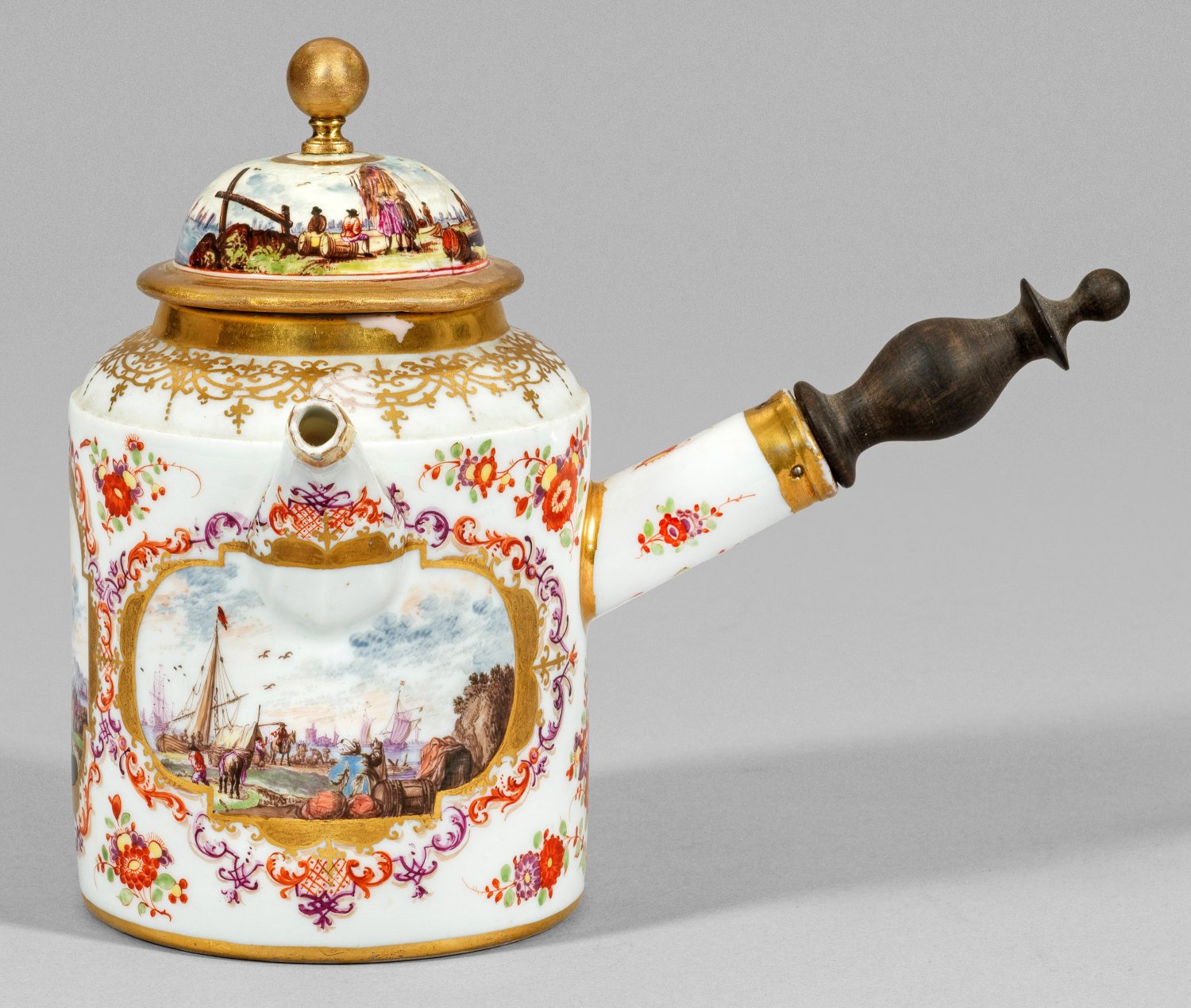Zylindrischer Korpus mit gerundeter Schulter. Seitlich balusterförmiger, goldkonturierter Griffansatz. In der Front gebogter Röhrenausguss. Aufgewölbter Deckel mit Kugelknauf. Auf der Wandung zwei ovale, große und eine hochrechteckige, kleine, goldornamentierte Vierpasskartusche mit eisenrotem und purpurfarbenem Laubwerk. Darin Tier- und figurenreiche Hafenszenen mit Kaufleuten, Waren und Handelsschiffen bzw. Wanderern in weitläufiger, architekturbestandener Landschaft. Allseits Indianische Blüten, auf der Schulter Bandelwerk. Äußerst feine, polychrome Malerei, wohl von Christian Friedrich Herold oder Johann Georg Heintze. Reiche Goldstaffage. Im Boden altes Etikett und die Gold-Nr. 47. Formerzeichen für Johann Martin Kittel (als Formerlehrling tätig seit 1719). Minim. best./Deckel rep.; Schwertermarke. Gesamt-H. 18 cm.