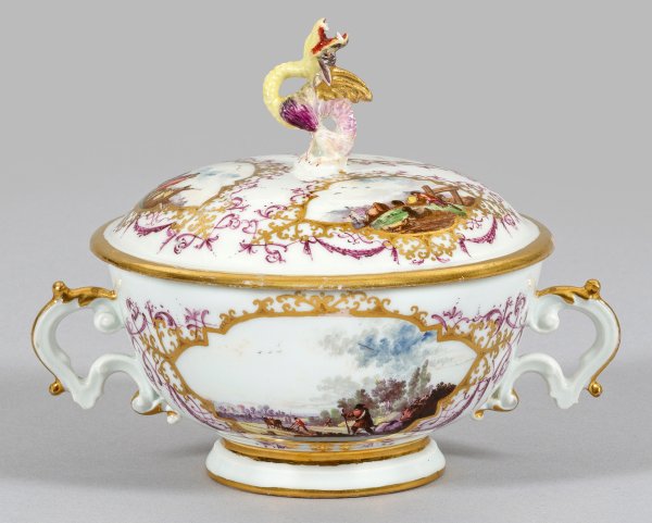 Über profiliertem Rundstand gedrückt halbkugeliger Korpus mit seitlichen Rocaillehenkeln. Passig aufgewölbter Deckel mit plastischer Bekrönung in Gestalt eines Fabeltiers. Auf der Wandung und dem Deckel vierpassige von purpurfarbenem und goldenem Laubwerk gerahmte Goldornamentreserven. Darin unterschiedliche, sog. Kauffahrtei- und Landschaftsszenen. Figurenreiche Darstellungen vor Hafenkulisse von Kaufleuten beim Verhandeln über angelandete Schiffladungen sowie Arbeiter zwischen Ballen und Fässern bzw. Landwirt beim Bestellen seines Ackers und Schäfer auf einer Wiese lagernd. Feine polychrome Malerei mit Goldstaffage in der Art von Christian Friedrich Herold. Vergoldermarke. Minim. rest.; Schwertermarke. H. 12 cm.