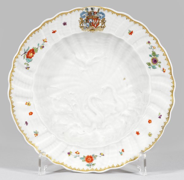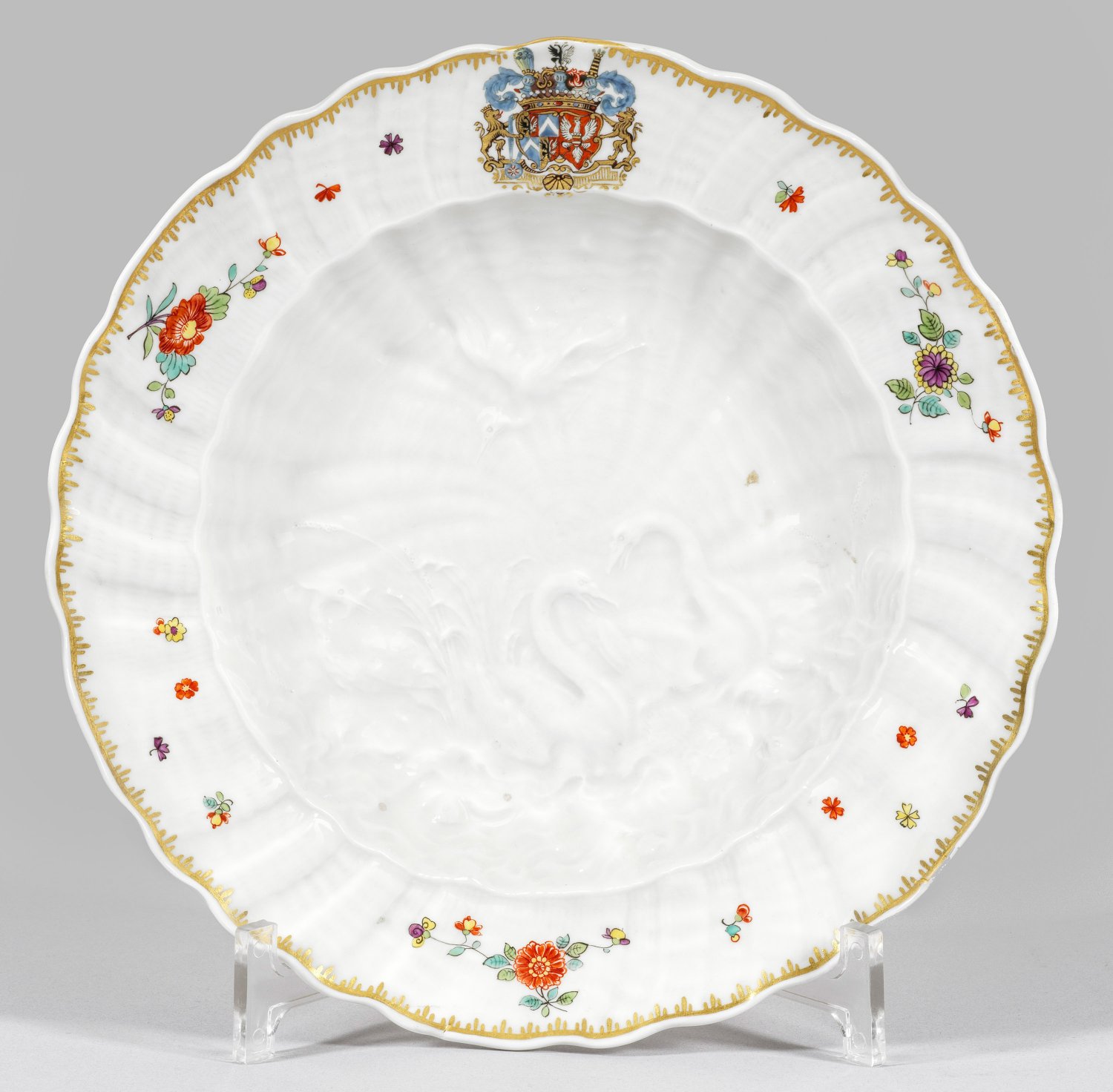 Runde Form mit passig geschweiftem Rand. In leicht vertieftem Spiegel ansteigender Reliefdekor aus zwei einander zugeneigten Schwänen, einem im Schilf stehenden und darüber fliegenden Fischreiher. Auf wellenförmig reliefierter Fahne Indianische Blütenzweige und Streublumen. Oberhalb Allianzwappen von Graf Heinrich von Brühl und seiner Gemahlin Franziska von Kolowrat-Krakowsky. Polychrome Malerei mit gekämmter Goldkannte. Entw. Johann Joachim Kaendler, 1736. Formerzeichen aus vier konzentrisch angeordneten Punkten. Minim. rest.; Schwertermarke. D. 23 cm.