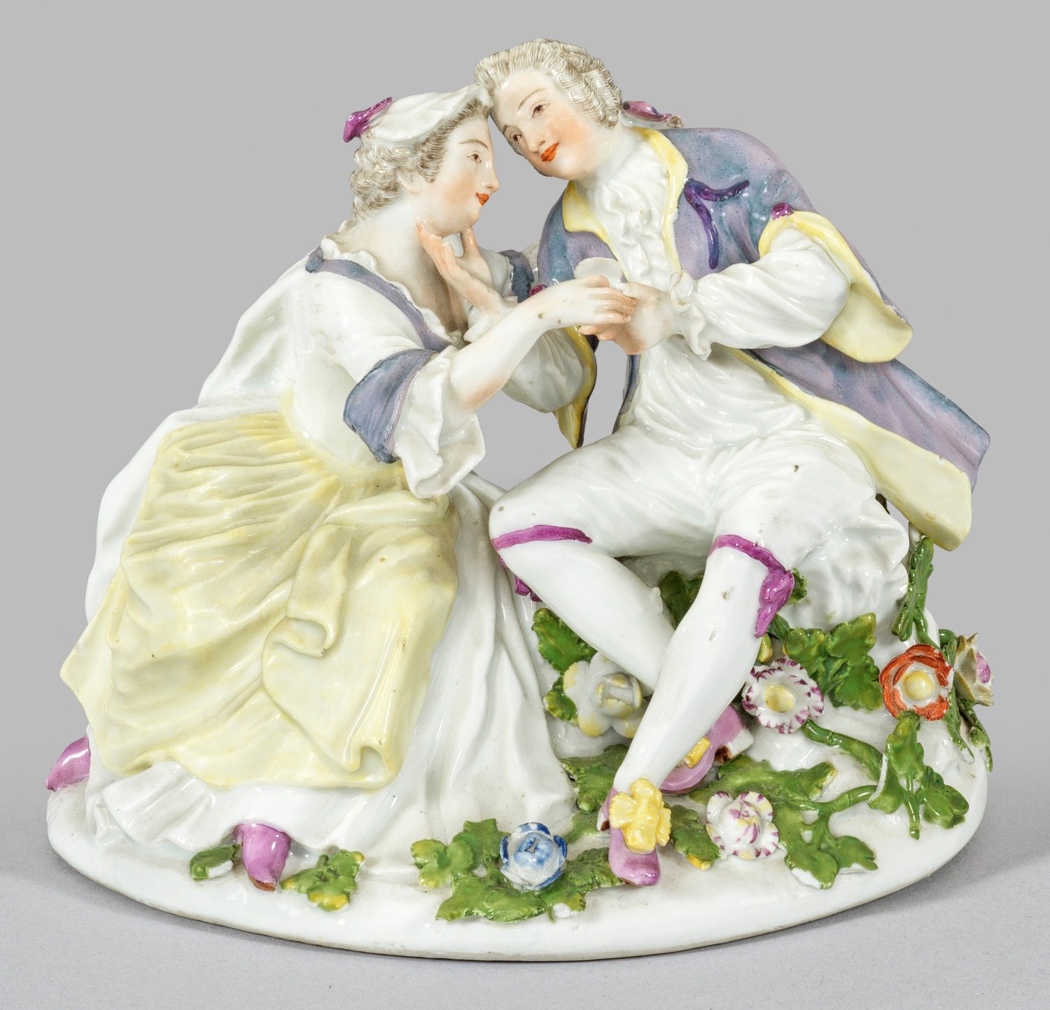 Auf unregelmäßigem, von plastischen Blütenranken belegtem Sockel sitzender, junger Kavalier in lavendelfarbener Jacke über weißer Hose und Hemd, seine Begleiterin zärtlich berührend und ihr aus einer geöffneten Tabatiere Schnupftabak anbietend. Polychrome Malerei. Entw. Johann Joachim Kaendler. Unw. best.; Schwertermarke. H. 13,5 cm.