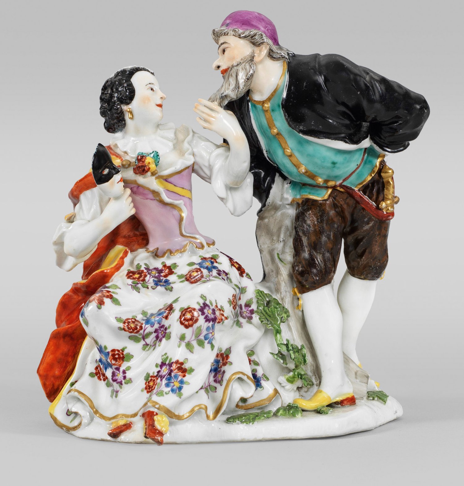 Aus der Italienischen Komödie. Auf einem mit plastischen Blüten und Blättern belegten Sockel sitzende Columbine in gelbem und rotem Umhang, fliederfarbenem Mieder mit edelsteinbesetzter Brosche über weißer Bluse und einem von Indianischen Blumen gemustertem Rock, mit der linken Hand den langen Bart des seitlich stehenden Pantalone berührend. In der rechten, erhobenen Hand eine Maske haltend. Polychrome Malerei mit dezenter Goldstaffage. Entw. Johann Joachim Kaendler, 1741. Prägeziffern 34. Minim. rest./unw. best.; H. 16,5 cm.