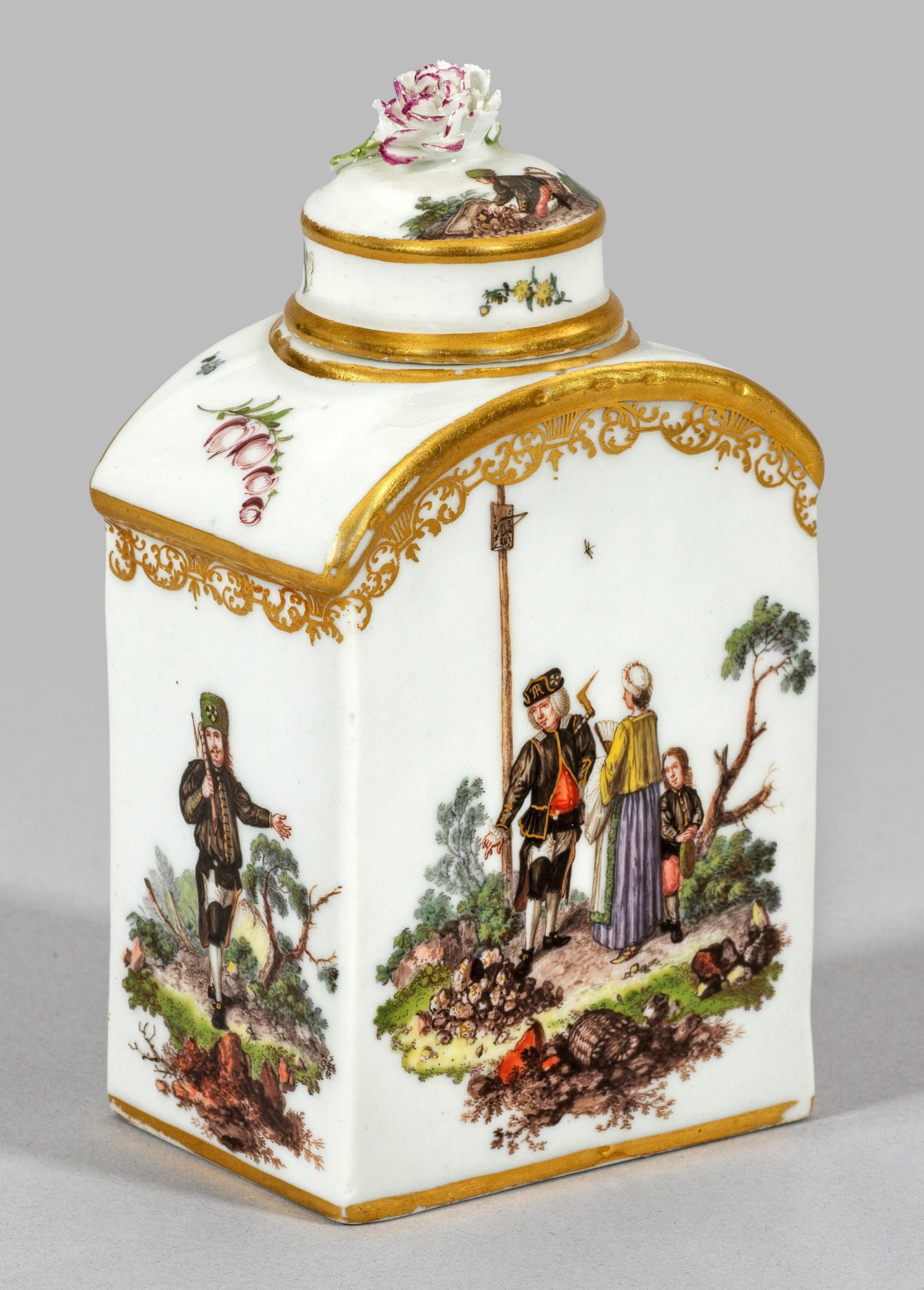 Rechteckiger Korpus mit abgerundeter Schulter, kurzem zylindrischen Hals und übergreifendem Deckel mit plastischem Blütenknauf. Allseitig unterschiedliche Darstellungen aus dem Leben der sächsischen Bergleute. Auf beiden Schauseiten szenische Darstellungen in felsiger, baumbestandener Landschaft, ein Bergbeamter im Gespräch mit einer Dame und nebenstehendem Bergjungen bzw. drei arbeitenden Bergmännern. Die Schmalseiten mit jungen Bergleuten bei ihren Tätigkeiten. Auf der Schulter kleine Blumengebinde. Äußerst feine polychrome Malerei wohl von Bonaventura Gottlieb Häuer (1710 - 1782). Umlaufende Goldspitzenbordüre. Deckel best.; Zertifikat beigefügt. Vergolderzeichen. H. 14 cm.