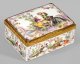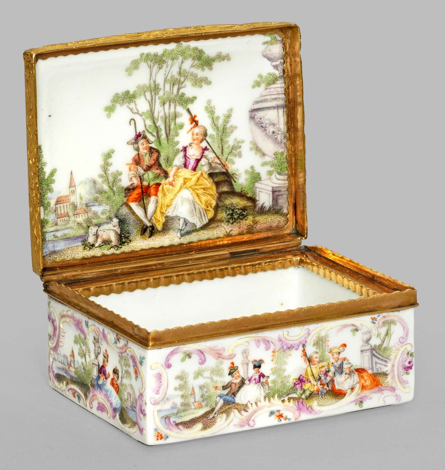 Porzellan mit Goldmontierung. Rechteckige Form mit leicht gehöhtem Scharnierdeckel. Allseits der Wandung, auf dem Deckel sowie der Bodenunterseite reliefierte, rocaillenförmige Rahmung mit szenischen Darstellungen galanter Paare, sog. Watteaufiguren in Parklandschaften. Im Innendeckel korrespondierender, spiegelfüllender Dekor eines im Park sitzenden Schäferpaares mit Lämmchen. Feine polychrome Malerei. Floral ornamentierte Goldmontage. 7 cm x 6 cm x 4,5 cm.
