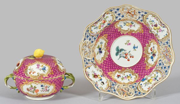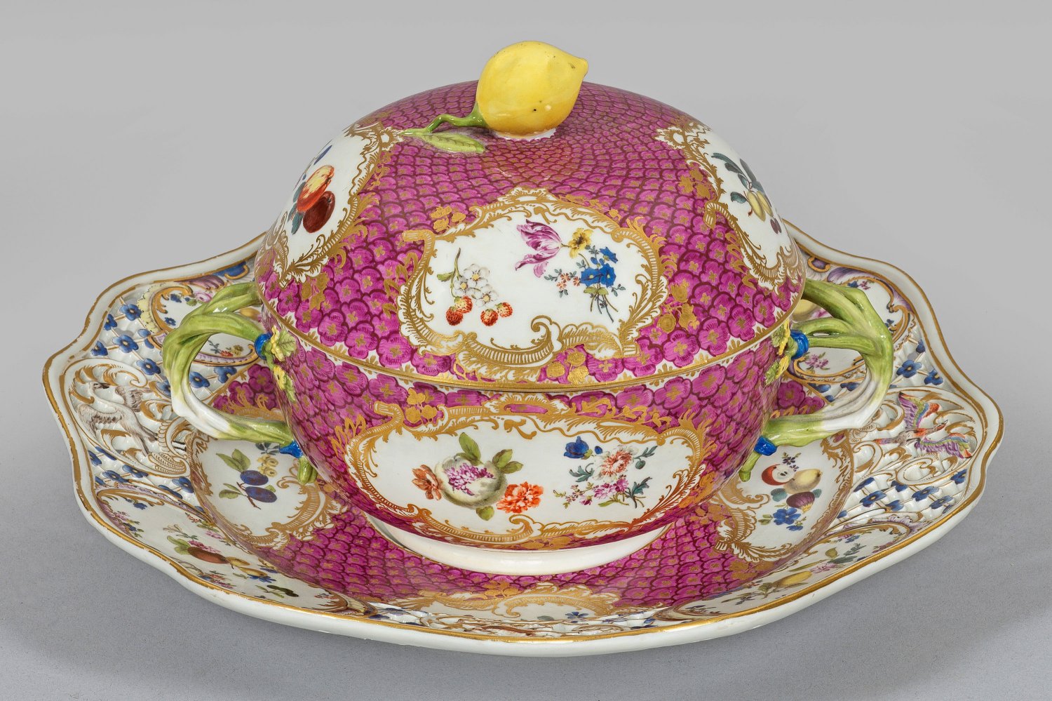 auf korrespondierendem Presentoir. Halbkugeliger Korpus, seitlich plastische Asthenkel mit aufgelegtem Blütenansatz. Aufgewölbter Deckel, mittig plastischer Zitronenknauf. Purpurfarbener, goldgezierter Schuppenmosaik-Fond. Im Spiegel und auf der Wandung Rocaillekartuschen mit Blumen- und Früchtearrangements auf weißem Grund. Korrespondierender Dekor in den Kartuschen des passigen Presentoirs, im Wechsel mit durchbrochen gearbeiteter Fahne im "Brühlsches Allerlei" mit Blüten und Tieren in Gestalt eines Schwans, eines Vogels und von zwei Eichhörnchen. Vereinzelte Blüten und Früchte im Innendeckel und der Innenwandung. Feine polychrome Malerei mit Goldstaffage. Partiell äußerst minim. rest.; Schwertermarke. Presentoir-D. 25,5 cm. Terrinen-H. 14 cm.