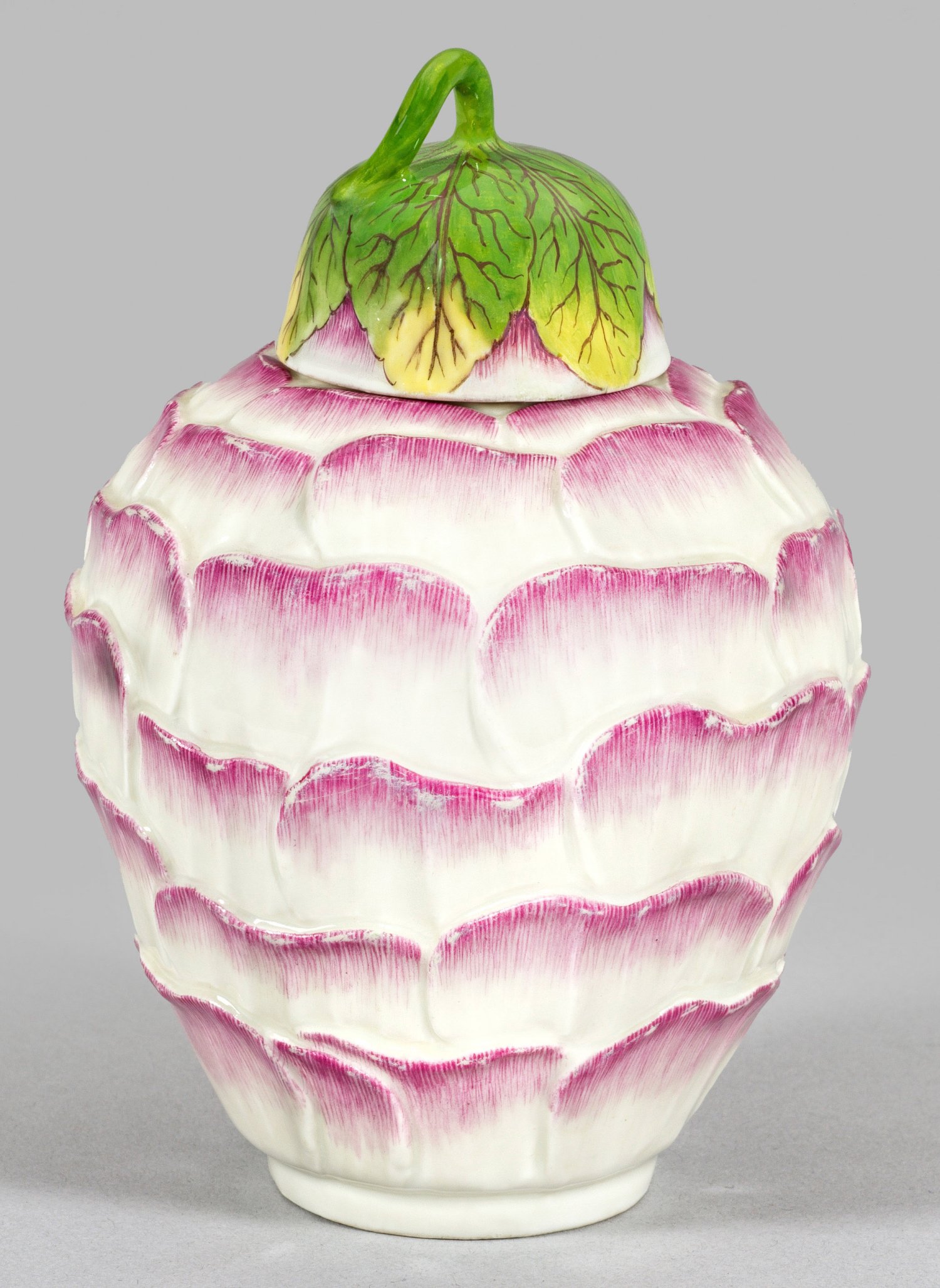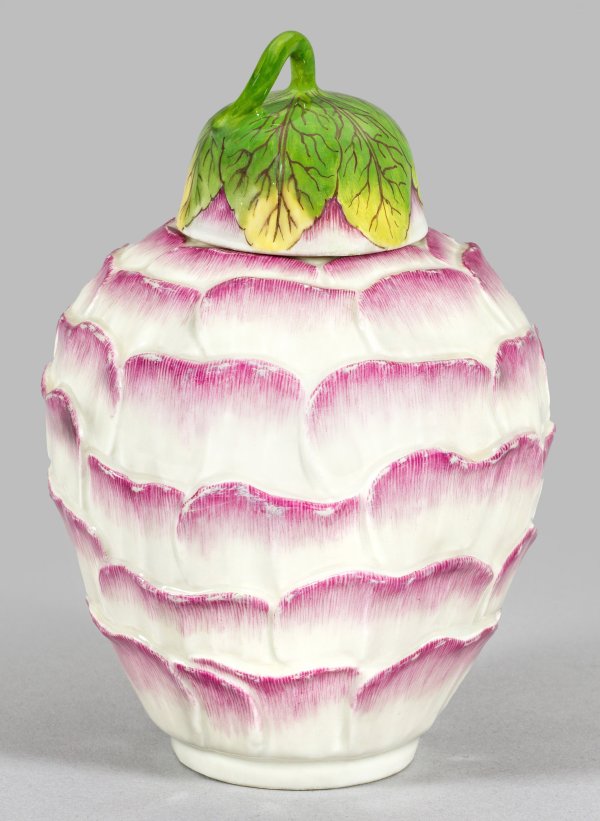 Eiförmig sich erweiternder Korpus mit passig aufgewölbtem Deckel, plastischem Blütenknauf und Blattkranz. Allseits der Wandung fein reliefierte Rosenblüten. Polychrome Malerei in Purpurfarben, Grün und Gelb. Entw. Johann Joachim Kaendler. Deckel unw. rest.; Alter Slg.-Aufkleber. Schwertermarke. H. 13 cm.