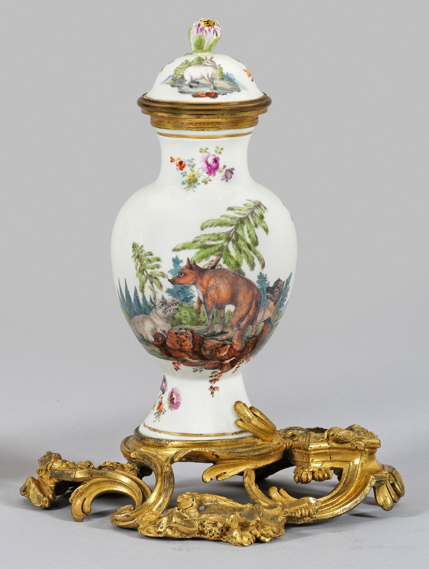 Rocailleförmig gerahmter Sockel aus vergoldeter, französischer Bronze. Darin eingelassene, balusterförmige Vase mit passig gewölbtem Deckel sowie plastischer Blütenbekrönung. Schauseitig der Wandung Waldlandschaft mit der Darstellung von drei Raubtieren, mittig auf Gesteinssockel majestätisch stehender Fuchs. Rückseitig Arrangement aus Holzschnittblumen, diese vereinzelt verstreut auch auf der Wandung. Korrespondierender Dekor auf dem Deckel. Feine und ausdrucksstarke Malerei mit Goldkontur. Bekrönung minim. best.; Gesamt-H. 25,5 cm.