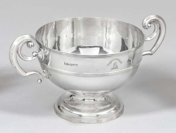 Sterlingsilber. Über trompetenförmigem Fuß, weit ausschwingende Kuppa, seitlich mit zwei volutierten Ohrenhenkeln. Glatte, mehrfach durch Profilwulste gegliederte Wandung. Schauseitig graviertes Wappenzeichen mit Devise "Fac Et Spera" der schottischen Familie Campbell of Possil. Gest., Beschaumarken, Herstellerzeichen, Jahresbuchstabe "r". Gew. ca. 460 g. H. 14,5 cm. D. 17 cm.