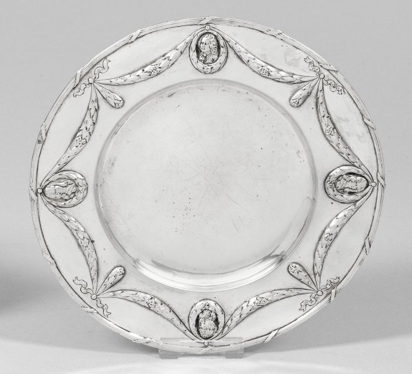 Silber. Gering gemuldeter Spiegel mit breiter, flacher Fahne und profiliertem Rand. Auf der Fahne reliefplastische Lorbeerfestons mit vier ovalen Medaillons und Darstellungen von Herrenporträts. Gest., Pseudomarken. Gew. ca. 335 g. D. 22,8 cm.