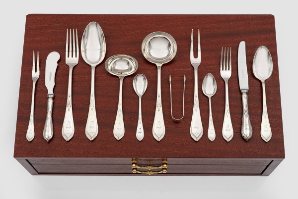 im Besteckkasten. Sterlingsilber. 44-tlg.; 7 Speisemesser, 7 -gabeln, 7 -löffel, 7 Kuchengabeln, 7 Teelöffel, 9 Vorlegeteile z. B. Suppenkelle, Saucenkelle, Vorlegelöffel, Zuckerzange. Randprofiliertes Heft mit vegetabilen, sich zu einer Knospe verjüngenden Zügen. Dekor "Bremer Lilie". Monogr. "L". Entw. Hugo Leven. Edelstahlklingen. Gest. 925, Herstellerzeichen. Gew. zus. ca. 2080 g (Gew. ohne gefüllte Teile ca. 1490 g).
