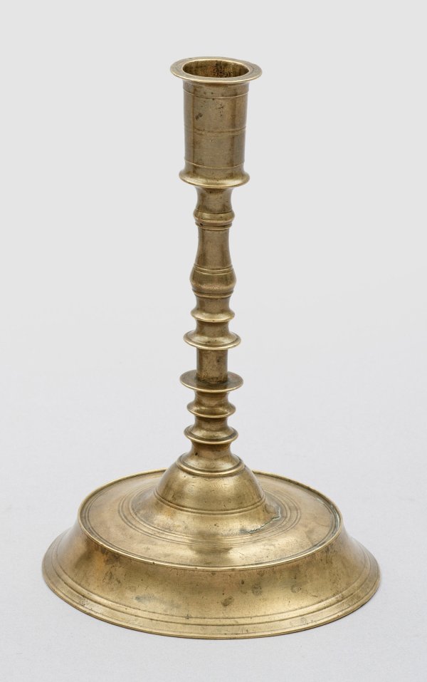 Messing. Die außen konkav gestufte, nach innen ansteigende Sockelplatte geht unmittelbar in den geraden Schaft über, der mit Nodi und einem Balusterelement gegliedert ist. Fast zylindrische Tülle mit kräftigen Randprofilen. Am Ansatz minim. ger.; H. 18,5 cm.