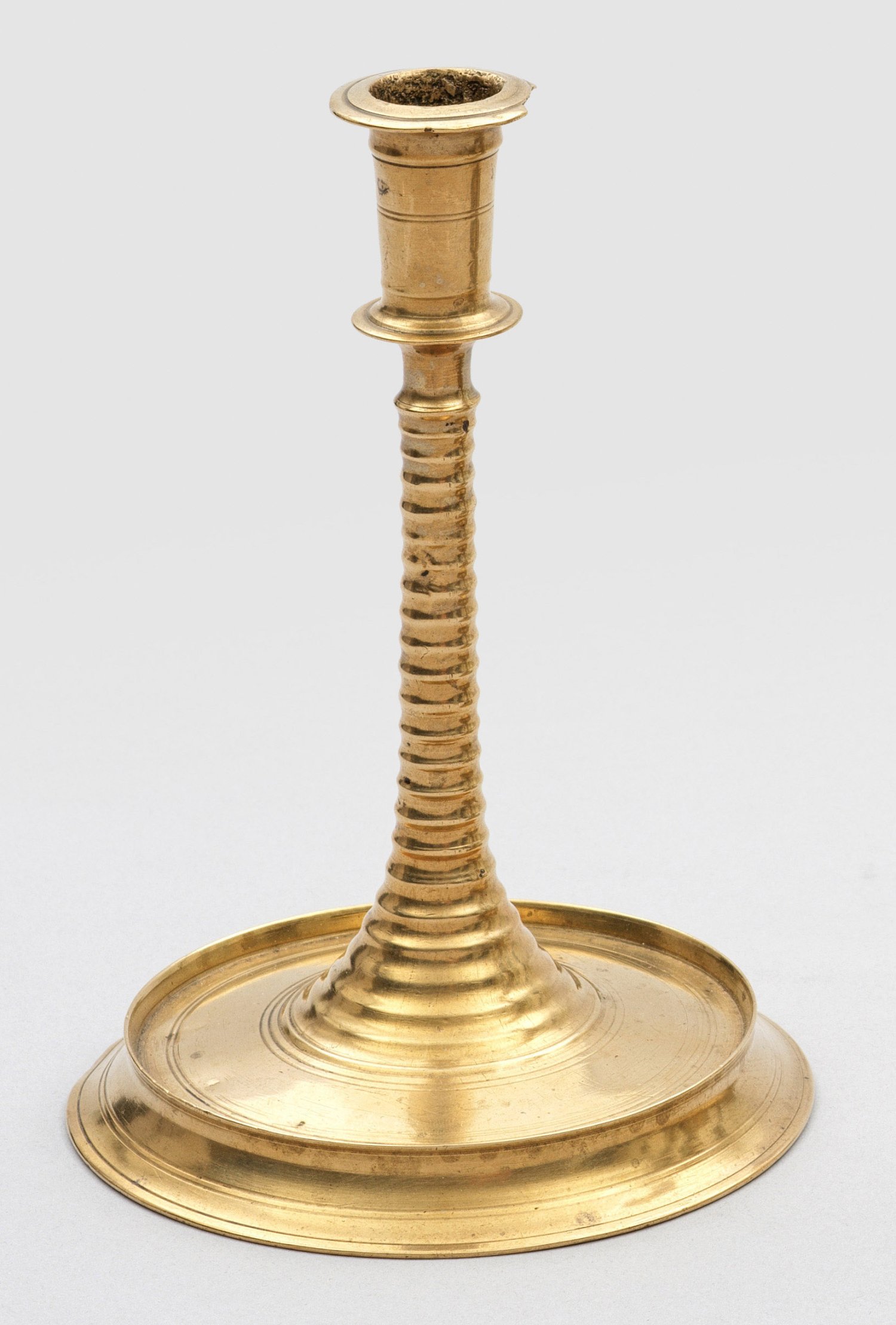 Messing.Die außen konkav gestufte, nach innen ansteigende Sockelplatte geht unmittelbar in den geraden Schaft mit durchlaufender Rillengliederung über, der sich nach oben leicht verjüngt. Zylindrische Tülle mit kräftigen Randprofilen. H. 16,5 cm. Stand-D. 11,5 cm.