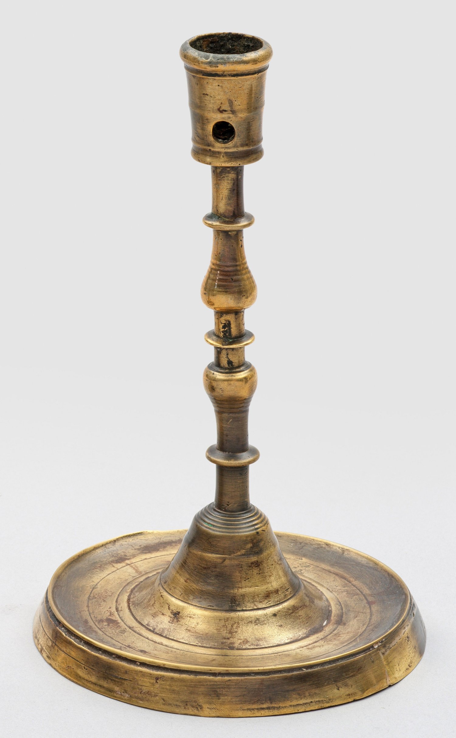 Messing, runder, konkaver Fuß umzogen von zarten Profilringen. Über glockenförmigem Ansatz, schlanker, zur Schaftmitte symmetrisch gegliederter und gespulter Schaft sowie konische, mehrfach gegliederte Tülle mit Reinigungsöffnungen. Rest.; H. 22,5 cm. Stand-D. 14,5 cm.