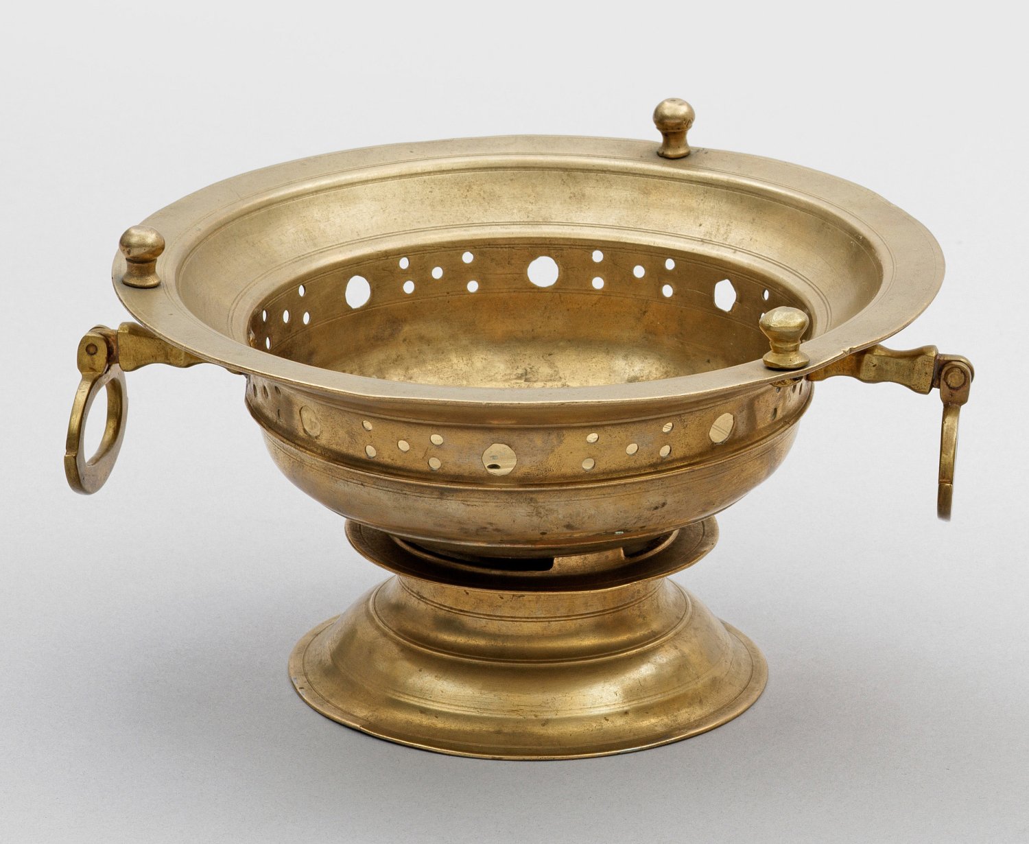 Messing. Tiefe, halbkugelige Schale mit Profilreifen und abgesetztem, weit ausladendem Rand, in der Mitte ein Fries mit Lochdurchbrechungen. Auf dem Rand drei kleine Kugeln, seitlich zwei ovale, gravierte Klappgriffe. Hoher, nach außen abfallender, abschraubbarer Fuß, der Aschenbehälter mit Ausschnitten für den Luftdurchzug. Rep., minim. gerissen. H. 11 cm. D. 18,5 cm.
