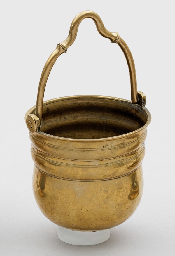 Messing. Annähernd zylindrisch, mit leicht gebauchter Unterhälfte, zwei Wellenprofilen in der oberen Hälfte und leicht ausgestelltem Rand mit zwei Ösen. Hoher, gerundeter Bügel, der über zwei seitlichen Knoten dreipassartig nach oben erweitert ist. H. 26,5 cm. D. 15 cm.