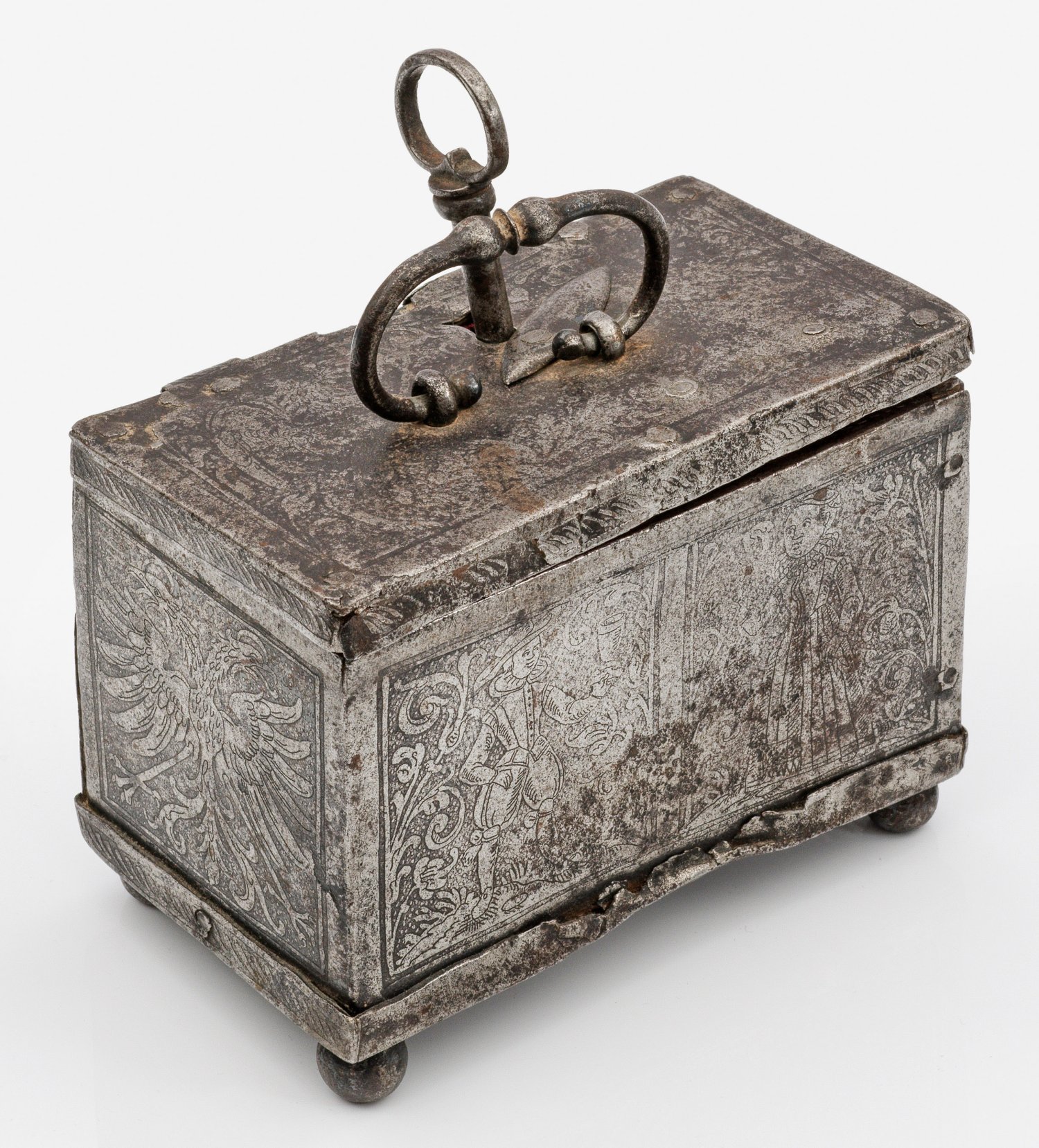 Eisen geätzt, innen bezogen mit rotem Stoff. Rechteckiger Korpus auf vier Kugelfüßen und Schanierdeckel mit verdeckbarem Schlüsselloch sowie beweglich montiertem Griff. Kanten teils sichbar genietet, Deckel und Boden leicht überkragend. Wandung schauseitig und rückseitig mit je zwei von Blattranken geschmückten Kartuschen. Darin schauseitig ein einander zu prostendes Pärchen, rückseitig zwei Vögel. Seitenflächen mit jeweils einem Doppeladler. Auf Unterseite Inschrift "Als verthan vor minem End mach ein richtig Tchestement und wer das selbig hat gedon last seine Erben redte gon. Anno 1629". Mit Schlüssel. Minim. besch.; H. 9 cm. 12 cm x 7 cm.