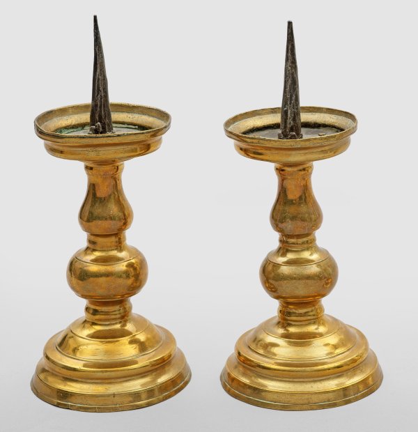 Messing. Aufgewölbter, mehrfach profilierter und gekehlter Stand, übergehend in einen durch Nodi und Profilringe gegliederten Balusterschaft. Weit ausschwingende Traufschale. Innen gestiftete Eisenplatte und spitzer Eisendorn. H. 31 cm.