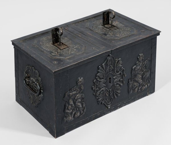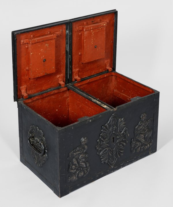 Eisen, gegossen und und geschmiedet, innen rot lackiert. Rechteckiger Korpus mit seitlichen Tragegriffen. Mittige Trennwand im Inneren, die beiden Hälften jeweils mit flachen Scharnierdeckeln bedeckt und separat mit je einer Zuhaltung verschließbar. Schauseite mit figürlichen Darstellungen und zentralem Scheinschloss, Deckelhälften jeweils mit einem Doppeladler in achteckiger Kartusche, Rückseite mit über Kreuz laufenden Bandbeschlägen. H. 43,5 cm. 80,5 cm x 46 cm.