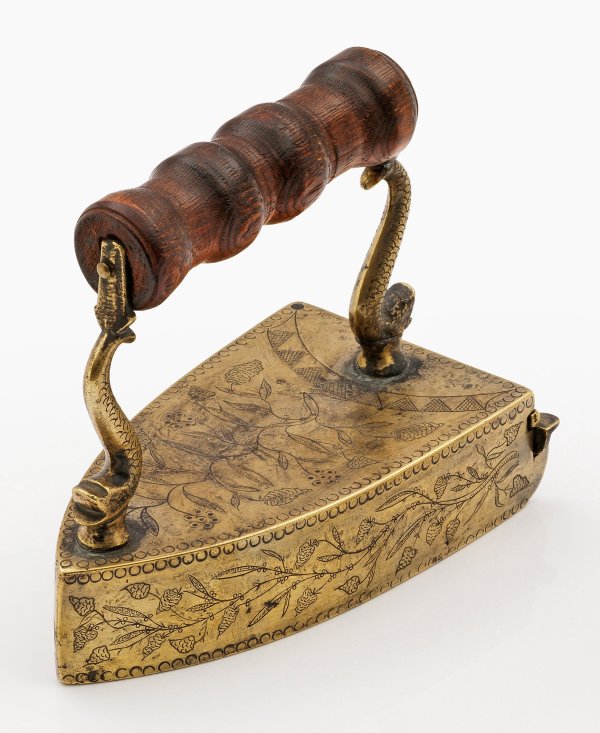 A German brass iron with iron core, engraved with herbal decor.