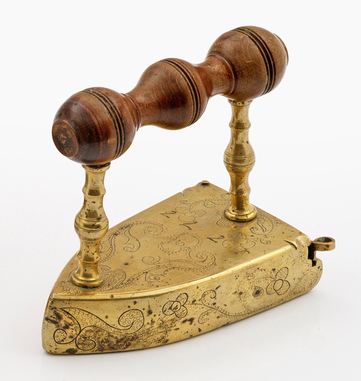 A German brass iron engraved with flower decor, dated 1777.