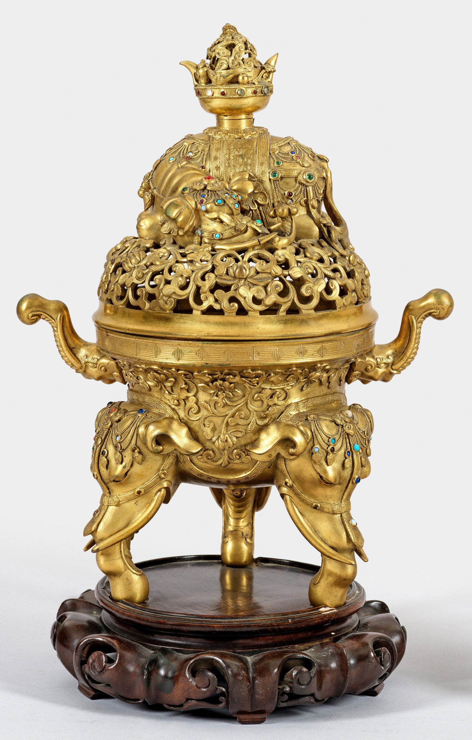 Messing, vergoldet auf rundem, geschnitztem Holzsockel. Über drei Elefantenköpfen als Füße ein runder, glockenförmiger Korpus mit zwei kleineren Elefantenköpfen als Handhaben und floralem Reliefdekor auf der Wandung. Deckel mit Wandung aus durchbrochen gearbeiteten Blattranken und bekrönt von einem ruhenden Elefanten, auf dessen Rücken ein weiterer, kleinerer Weihrauchbrenner steht. Bunte Farbsteine. Minim. best.; Steine fehlen teilw.; Gesamt-H. 45 cm.