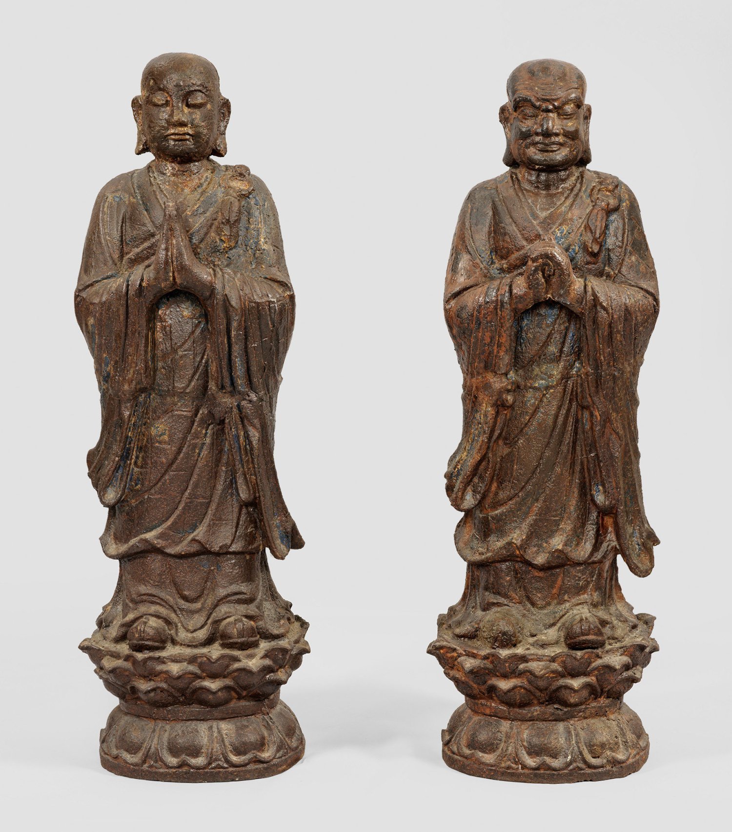 Two large Chinese iron figures representing Buddha's two favorite disciples Ananda and Kasyapa. Rubbed.