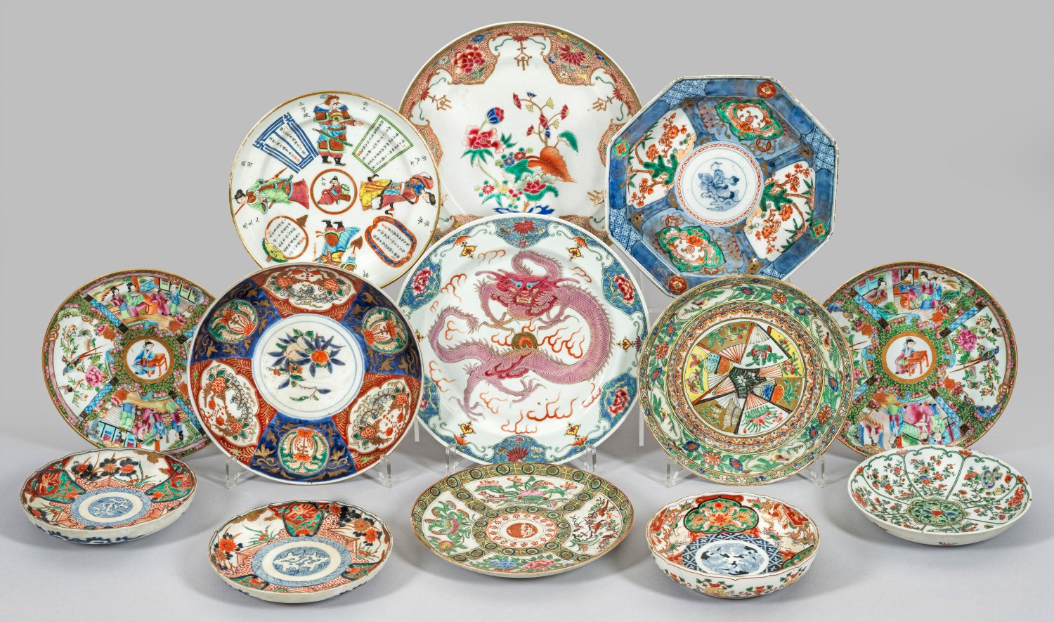 Porzellan. 13-tlg.; 8 Teller, 5 Schalen. Runde Grundform, glatter, geschweifter und achteckiger Rand. Figurale Szenen, Drachen, verschiedene Pflanzen und geometrische Ornamente in polychromer Malerei, teilw. unterglasurblau/ Emailmalerei/ Gold gehöht. Teilw. gem.; Ber., teilw. best., Haarrisse. D. 15 cm - 24,5 cm.