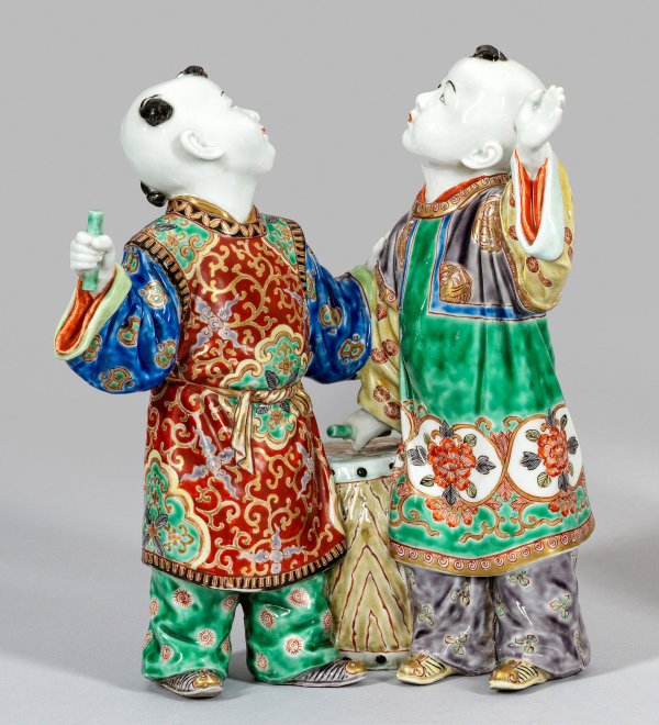 Porzellan. Vollplastische Darstellung zweier Jungen in traditioneller Kleidung, die vor einer großen Trommel stehen, in der rechten Hand jeweils einen Trommelstock. Polychrom bemalt. Minim. ber./best.; H. 28 cm.