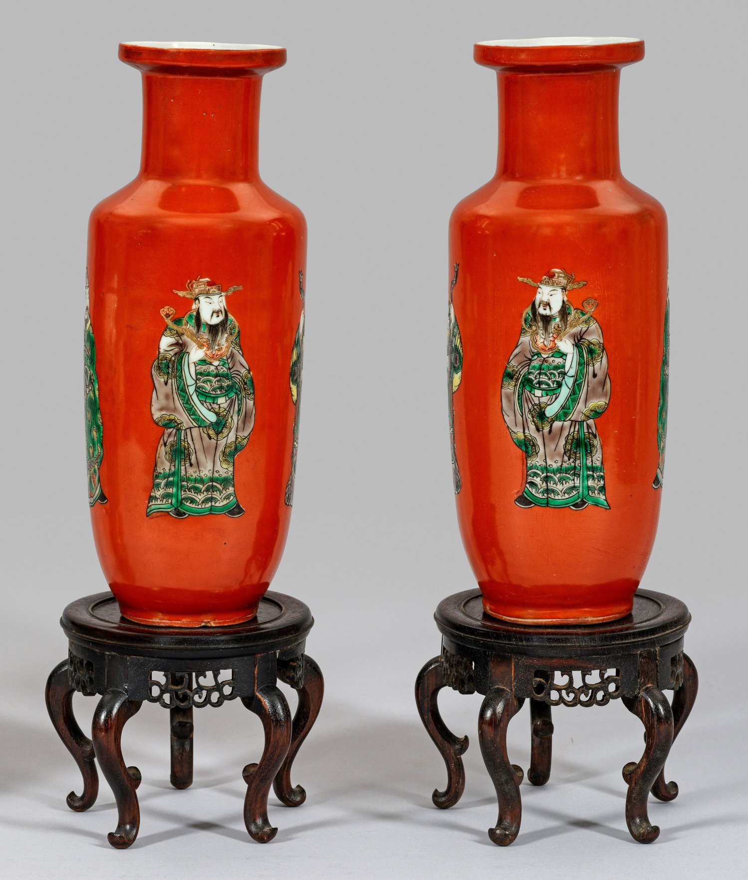 Porzellan auf hochbeinigen Holzsockeln mit Volutenfüßen und durchbrochen geschnitzten Seitenornamenten. Außenwandung mit tomatenrotem Fond, darin taoistische Weise in polychromer Malerei. H. 30 cm.