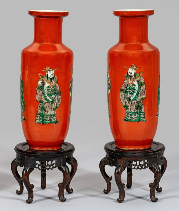 A pair of Chinese porcelain roleau vases with tomato red fond and Taoist wises.