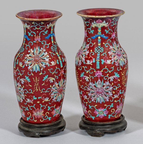 Porzellan auf Holzsockeln. Sang de boeuf Flambé-Glasur mit stilisierten taoistischen Blüten, Blattranken und Glückssymbolen in polychromer Emaillemalerei. Minim. ber.; Gesamt-H. 24,5 cm.