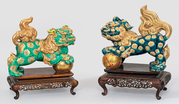 Porzellan auf Holzsockeln. Vollplastische Figuren zweier Fo-Hunde mit Kugeln spielend. Grüner bzw. türkiser Fond mit goldenen Sonnen und farbigen Details. Sockel auf je vier Volutenfüßen, Seitenfelder durchbrochen ornamentiert. L. 31 cm. H. 24,5 cm (ohne Sockel).