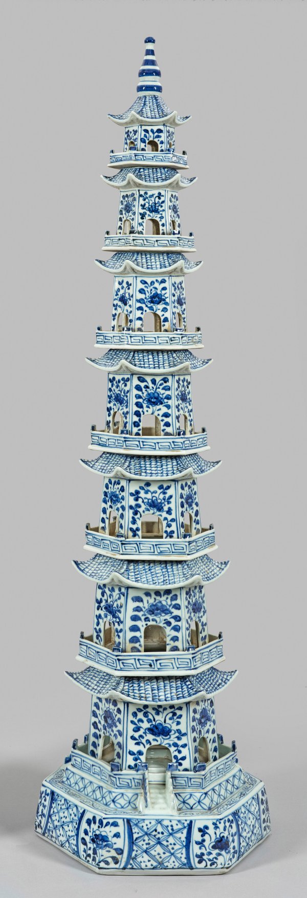Sechseckige Grundform. Auf einem Sockel sieben weitere, aufsetzbare Stockwerke mit umlaufenden Balkonen, gerundeten Türöffnungen in jeder Wand und Dächern, bekrönt von einem zwiebelförmigen Dach. Florale und ornamentale Musterung sowie angedeutete Dachschindeln in unterglasurblauer Malerei. Minim. best.; H. 120 cm