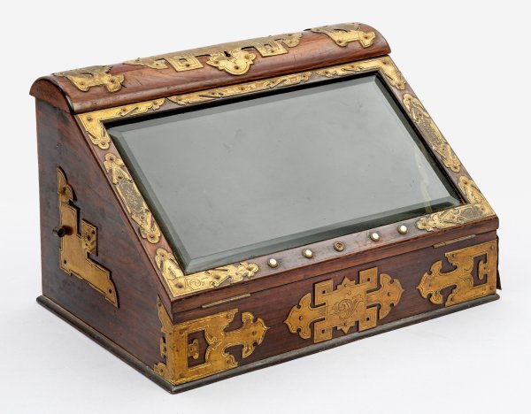Palisander sowie Applikationen aus Messing. Gerader, rechteckiger Korpus mit schräggestellter, facettverglaster, ehemals aufklappbarer Front. Verschlossen. Ohne Schlüssel. H. 25 cm. 39 cm x 27 cm.